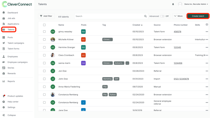 Nun werden alle Talente, die sich bereits im System befinden angezeigt.