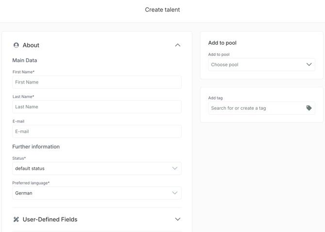 Nun wird die entsprechende Übersicht „Talent erstellen“ angezeigt. Innerhalb dieser Ansicht können nun alle relevanten Informationen des Talents manuell eingegeben werden. Unter anderem können Dateien hochgeladen, benutzerdefinierte Felder verwendet und Datenschutzabfragen erstellt werden.