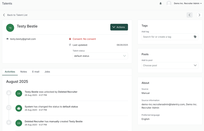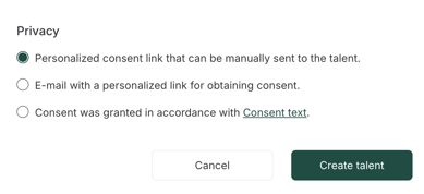 ❗️Sobald personenbezogene Daten manuell in einem System gespeichert werden, muss die betroffene Person darüber informiert werden. Hat das Talent noch nicht eingewilligt, werden die erhobenen Informationen nicht im Talentprofil angezeigt. Die Daten werden erst nach Bestätigung der Datenschutzanfrage des Talents im Profil angezeigt.❗️