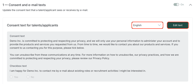 When you click on "Edit text", you will also see all available languages and can edit the text for each of them. You will be able to change the introduction text, which will explain what the consent is for and why it is necessary for the talent to accept and you can change consent question itself. After you have changed the text, don't forget to click the "save"-button.