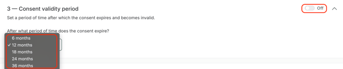 After you have create the text and Email, don't forget to set a validity period for the consent. This can be done under "3 — consent validity period". After you have selected the duration of which your consent is valid, don't forget to the turn the function on.