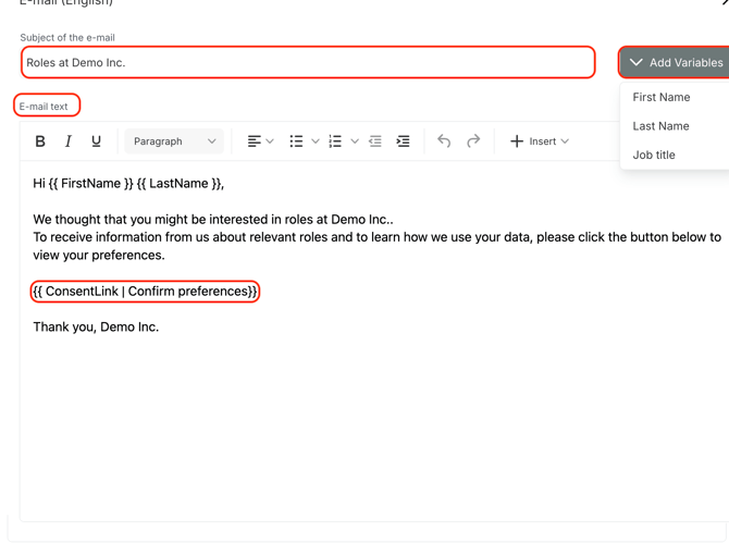 Here you can edit the subject of the e-mail and the content of the e-mail. If you want to add variables to the email text you can simply press on the right side on "Add Variables" and select the variable. Since the name and surname will be in our database, their names will be put into those variables and the e-mail is more personalised.