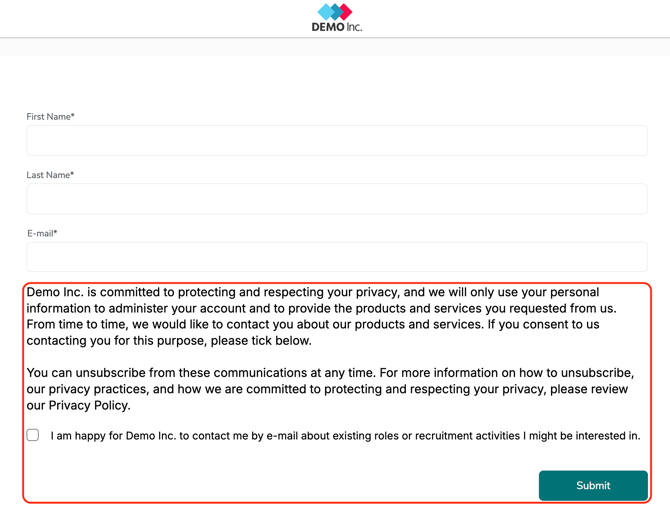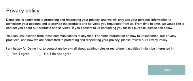 - Consent via a link made available to the talent outside of the CRM system, e.g. via email.
