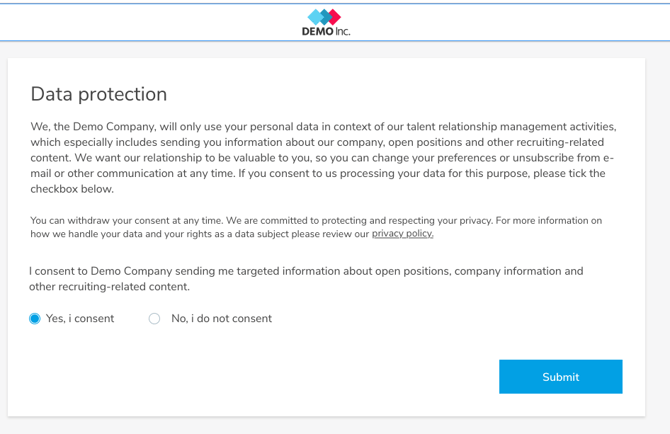 If you are ever audited, having evidence of consent at the ready will help you comply with GDPR commission. By law, you are required to have this proof of consent stored for Talent from the EU.