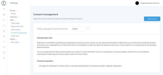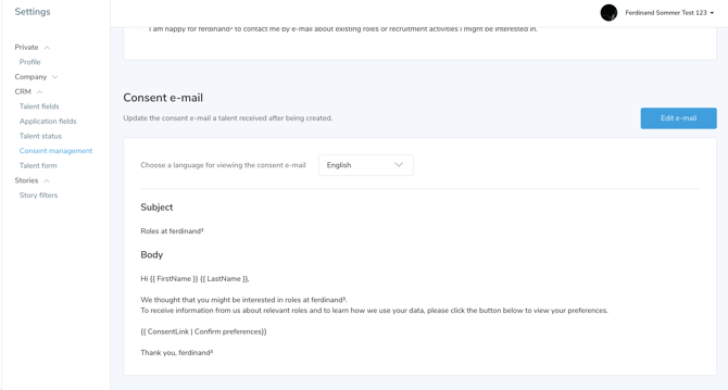 We provide the possibility to send the consent request to talent directly via email. As this is a critical and personal topic we give the option to customize this email. In order to customize this go to the "Settings" and here you can find a point called "Consent Management". Here you can update / change / delete the text of the email.