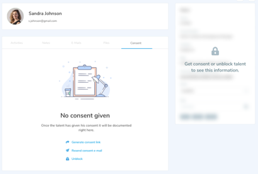 Consent always has a specific period attached to it. This is customizable which you can read further down. If the consent is expired, the Talent will be blocked again, and his data is no longer accessible.