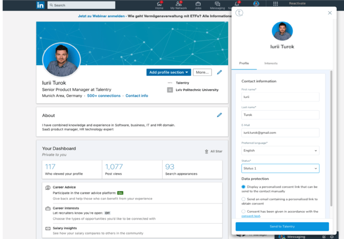 A recruiter can use our browser extension "CleverConnect Sourcer" to transfer profiles to the CRM with a single click while sourcing on networks such as LinkedIn, XING or StackOverflow. Typically, this happens after a candidate has indicated interest in further contact during the conversation.