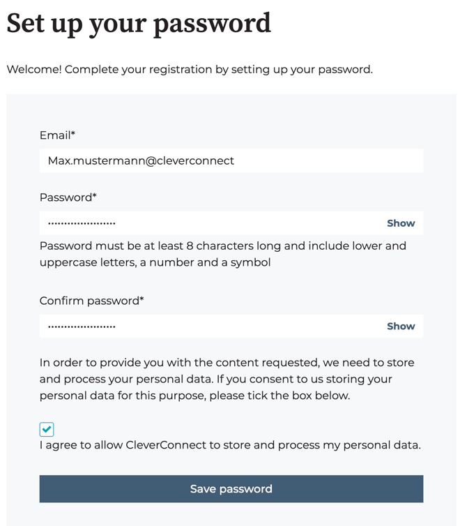 Please enter your Email and create a password that consists of a minimum of 8 letters, including a lower and upper case letter, a number and a symbol.