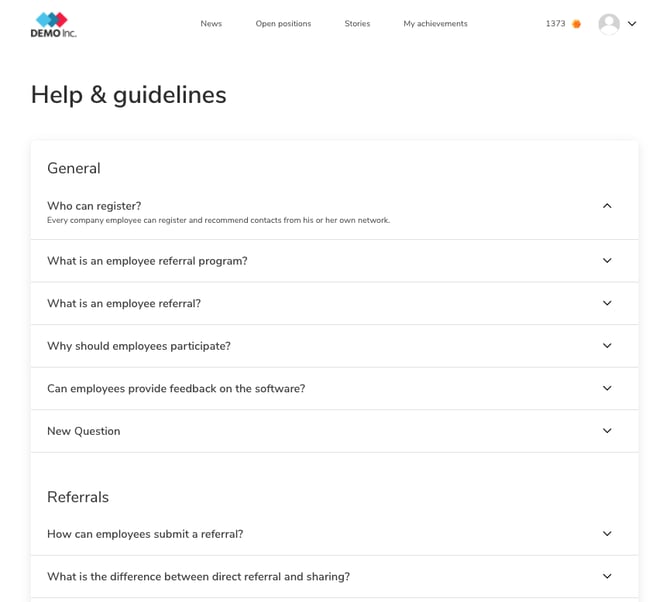 | The FAQs are divided in General, Referrals, Rewards,User Account & Privacy and can be edited with customer-specific questions and answers through our support. | ![]() |