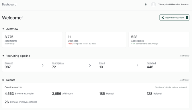 This will give you information about how many talents you have created (by source and date) and show you the status conversion as well as some GDPR / consent information, the activity of the different user roles and how many campaigns you are sending out to talents etc.