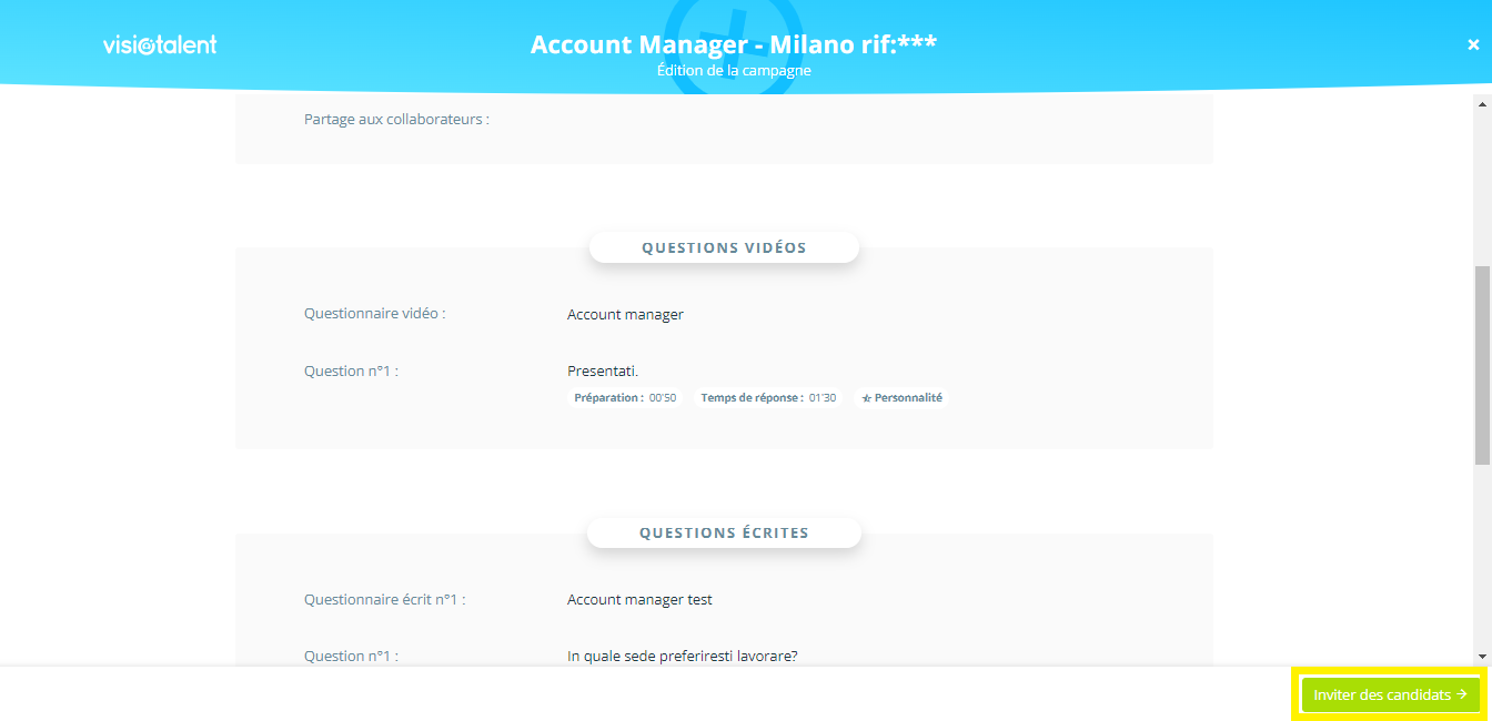 Inviter des candidats depuis Visiotalent tout de suite après la création de ma campagne