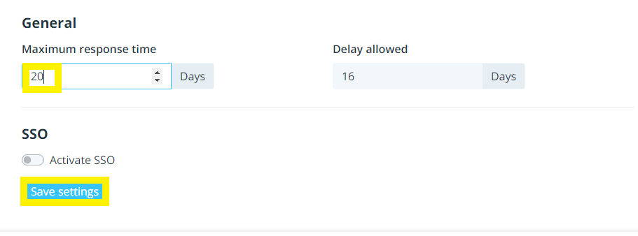 - Je vais dans le Panel, puis dans les Paramètres et je clique sur le nombre de jours dans le paramètre " Délai de réponse maximum " pour modifier le nombre de jours.