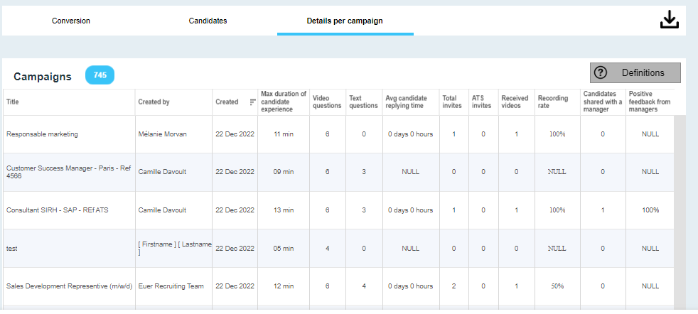 et via cette page, vous pouvez également exporter les détails par campagne :