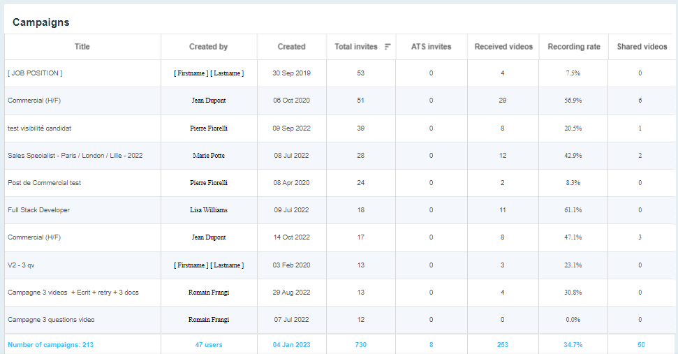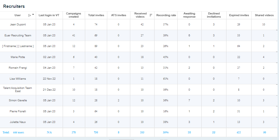 La page des statistiques vous permet de comprendre votre utilisation de Visiotalent.