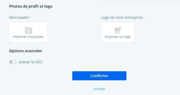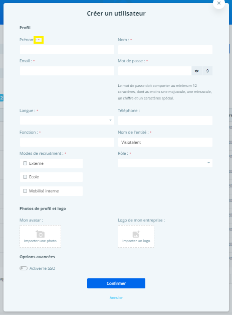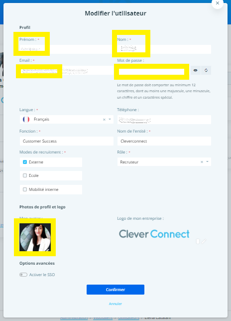 Attention : copier-coller le mot de passe avant de cliquer sur le bouton Confirmer, afin de pouvoir envoyer au nouvel utilisateur ses identifiants de connexion à la plateforme. - Vous pouvez ensuite insérer la photo du recruteur et le logo de l'entreprise et cliquer sur Confirmer.