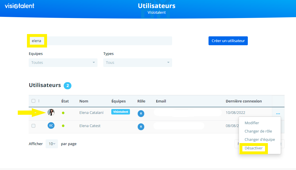 Dans la section Utilisateurs, vous pouvez créer de nouveaux utilisateurs, changer leur rôle, modifier ceux qui existent déjà, les désactiver et modifier l'équipe à laquelle un utilisateur appartient.